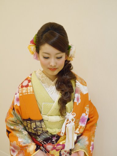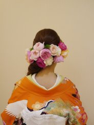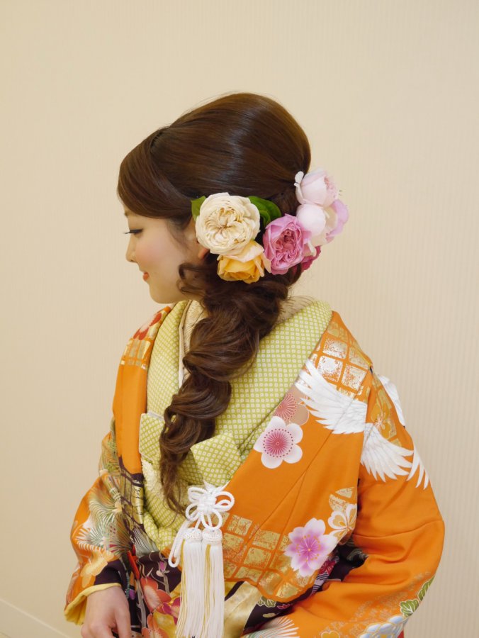 トップをまとめ、洋花を引き立たせトップとのボリュームと合わせる為に、ウィッグを使用し緩めの三つ編みでアレンジしたスタイルです。