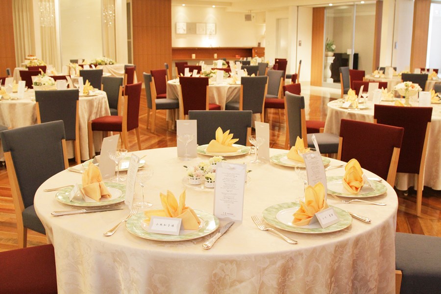 解放感たっぷりの会場にオレンジを効かせて爽やかに