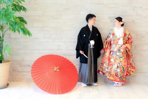 洋風な雰囲気ではありますが、和装の撮影 特に色打掛は白い壁にお着物の色が映えて