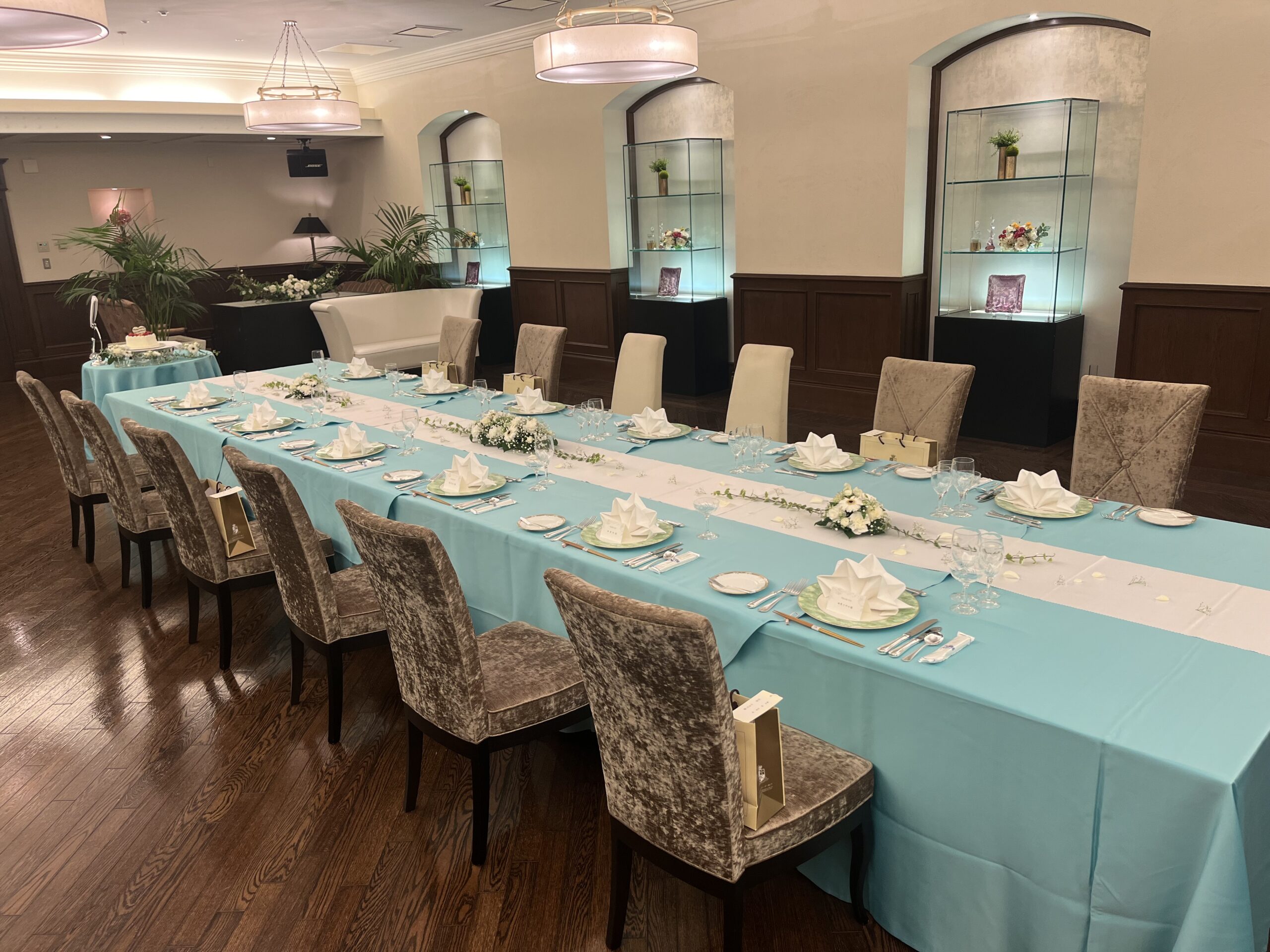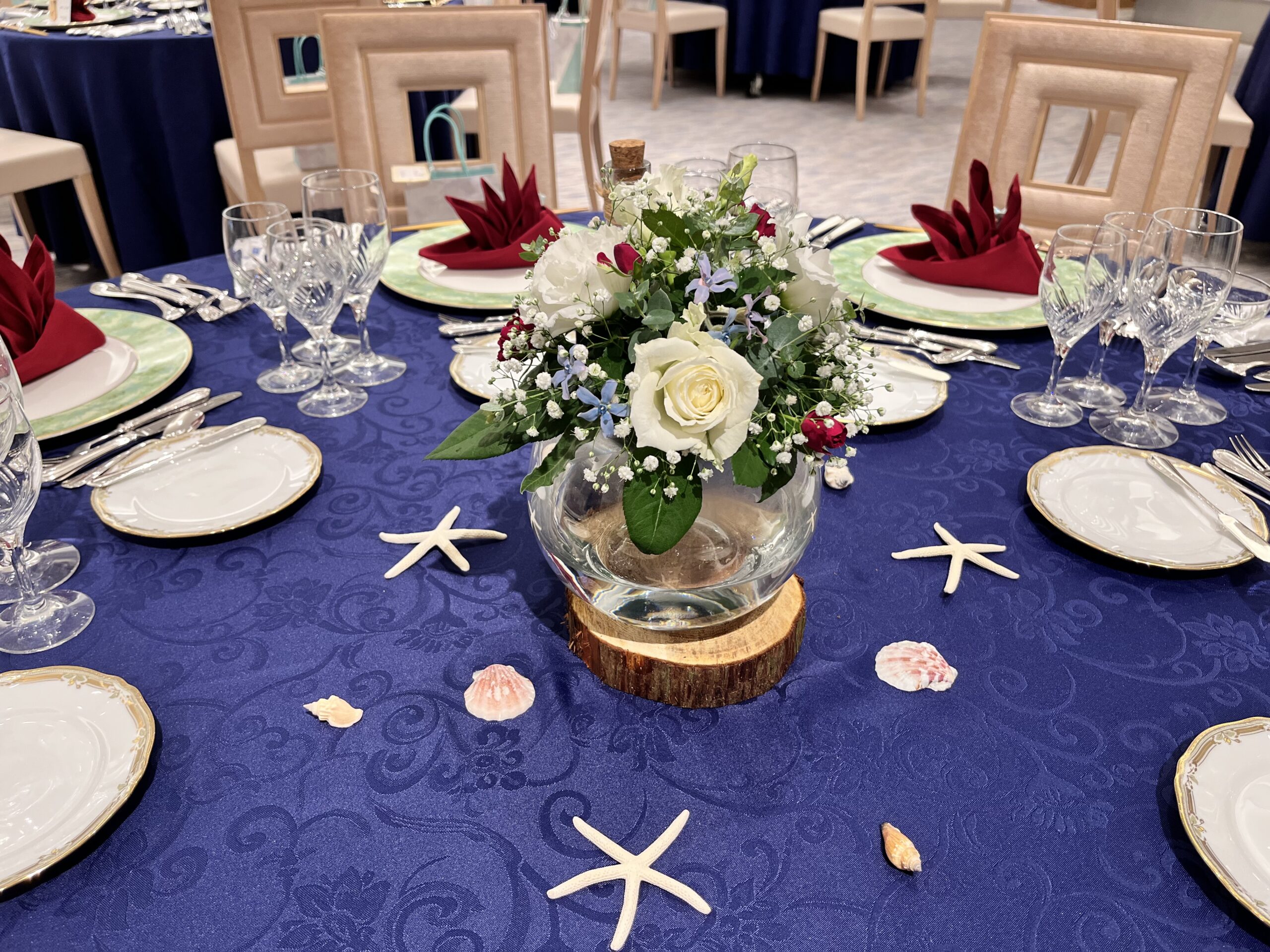 海をテーマに会場のクロスや装花もブルーで合わせていたいただくのも綺麗です