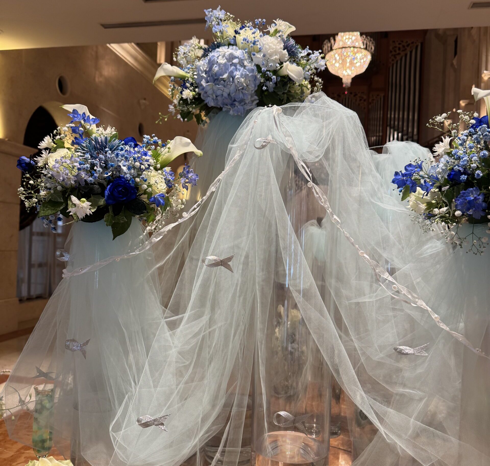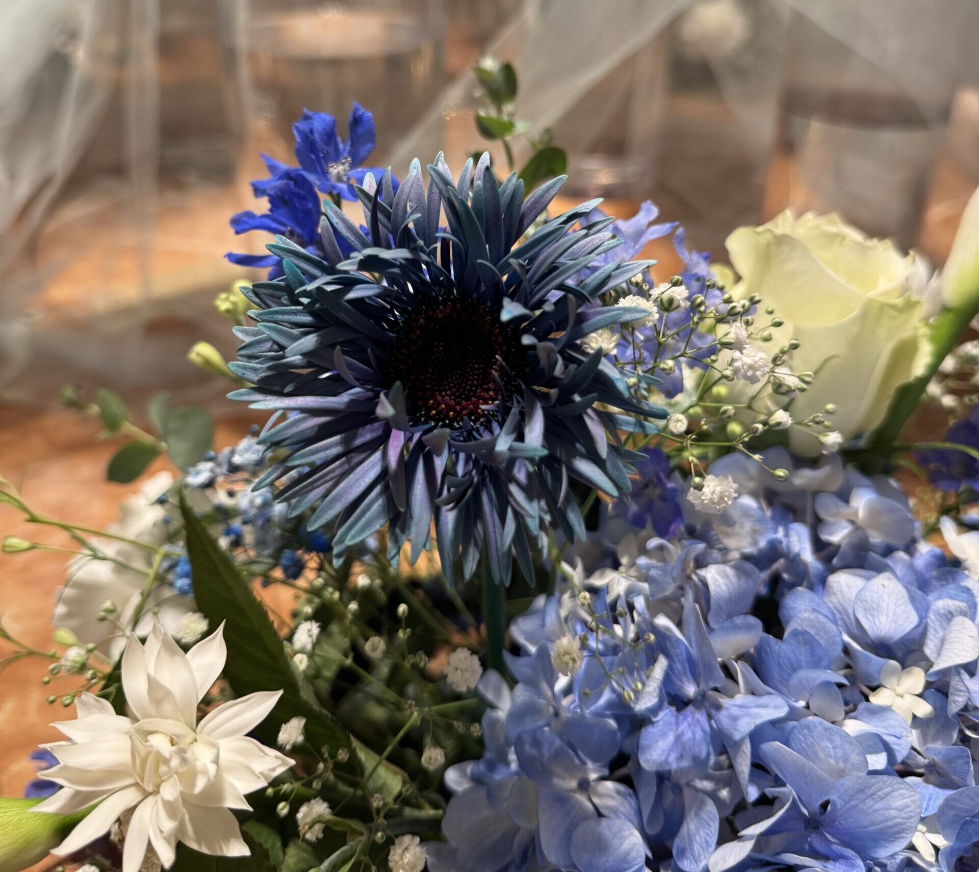 淡い青、濃い青、水色と白の爽やかなアレンジです✨