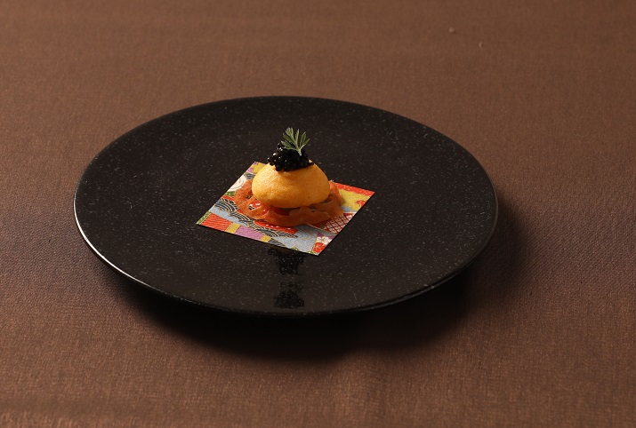 まるでマシュマロのような、ふわっとした不思議な食感のギモーブ。人参のやさしい甘みが口いっぱいに広がり、添えられたキャビアの繊細な塩味が、全体の味わいをぐっと引き締めます。見た目の可愛らしさと、意外な味の組み合わせをお楽しみください。