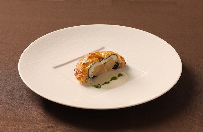【ホタテ貝柱とポルチーニ茸のパイ包み ポワローのクリームソース】