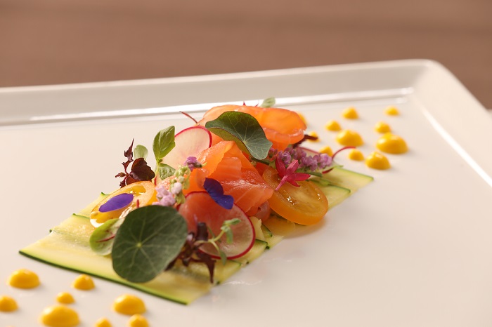 脂の乗ったノルウェーサーモンを、特製のマリネ液でじっくりと漬け込みました。しっとりとしたサーモンに、さわやかな酸味とハーブの香りが溶け合い、食欲を刺激します。彩り豊かな野菜を添えた、見た目にも華やかな一皿です。
