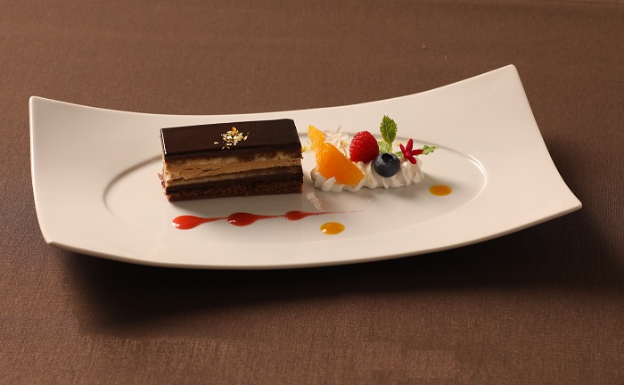 涼しくなる季節にこそ味わいたい、濃厚なチョコレートのガトーオペラ。幾層にも重ねられたチョコレートとコーヒーの風味が織りなす、大人の味わいです。なめらかなカスタード風味のアングレーズソースが、リッチなデザートに軽やかさを添えます。
