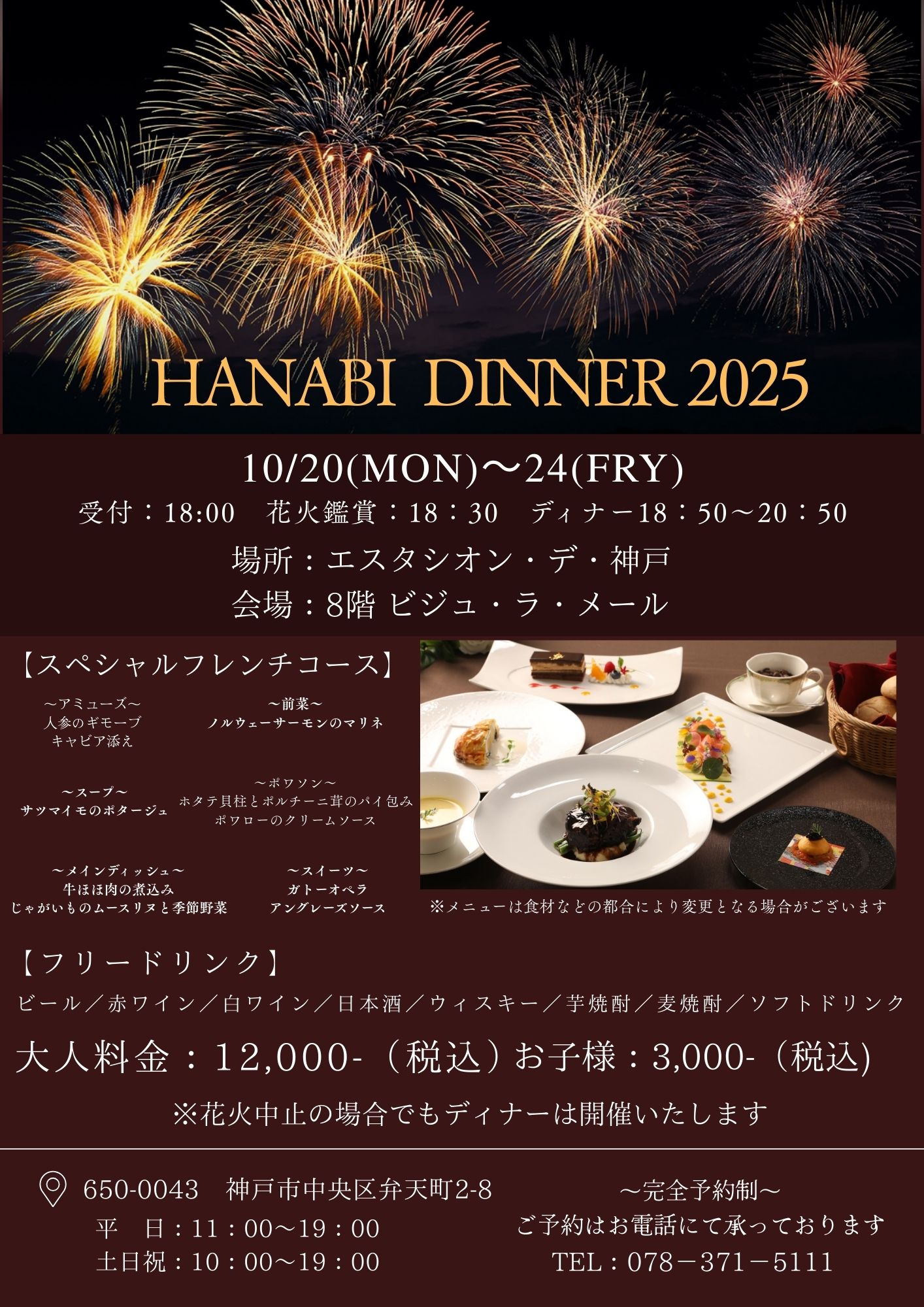 エスタシオン・デ・神戸の近くにあるメリケンパークでは10/20~10/24までの5日間花火が打ち上げられます🎆それに伴いエスタシオン・デ・神戸でも花火をご覧いただいた後シェフによるフレンチコースを召し上がっていただく5日間限定のディナーイベントを開催いたします💛