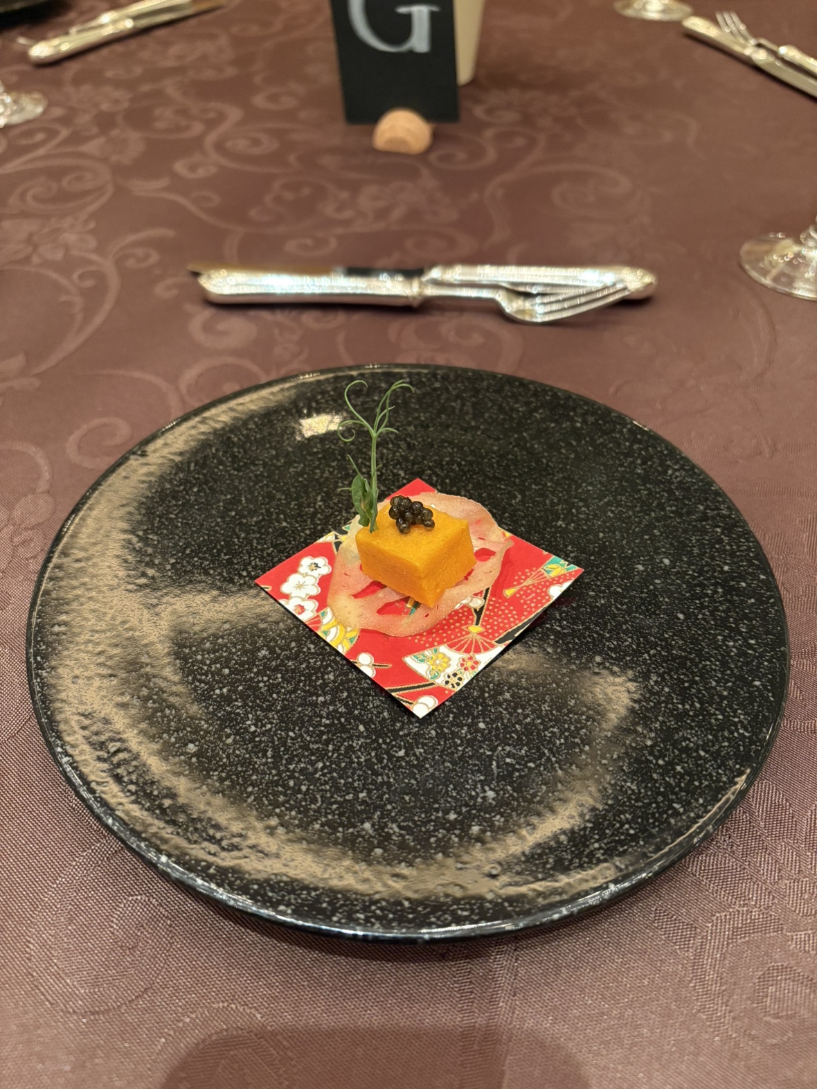「人参のギモーブ」は人参の甘味と上にのったキャビアの塩味、レンコンチップスの食感