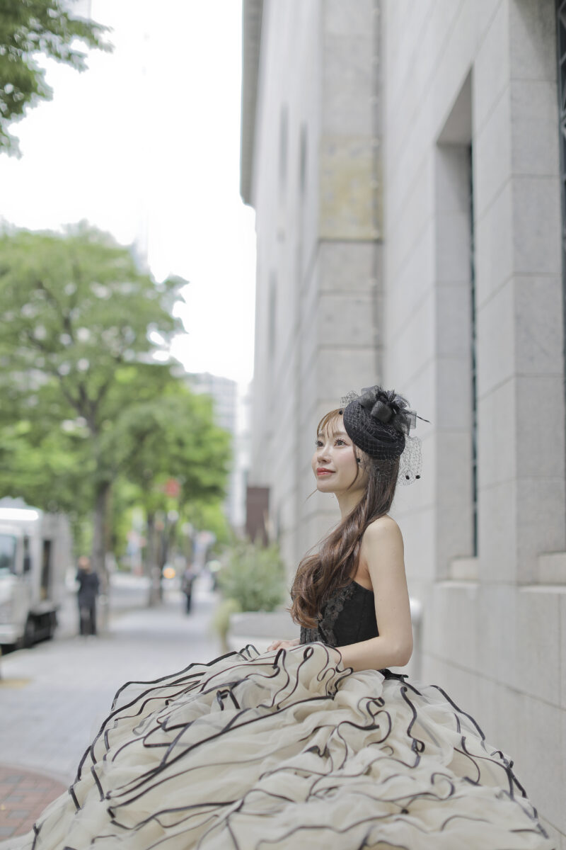 オーバースカートを外すことで、黒とベージュのチュールを重ねたシンプルで知的な大人のドレスへと変化💫