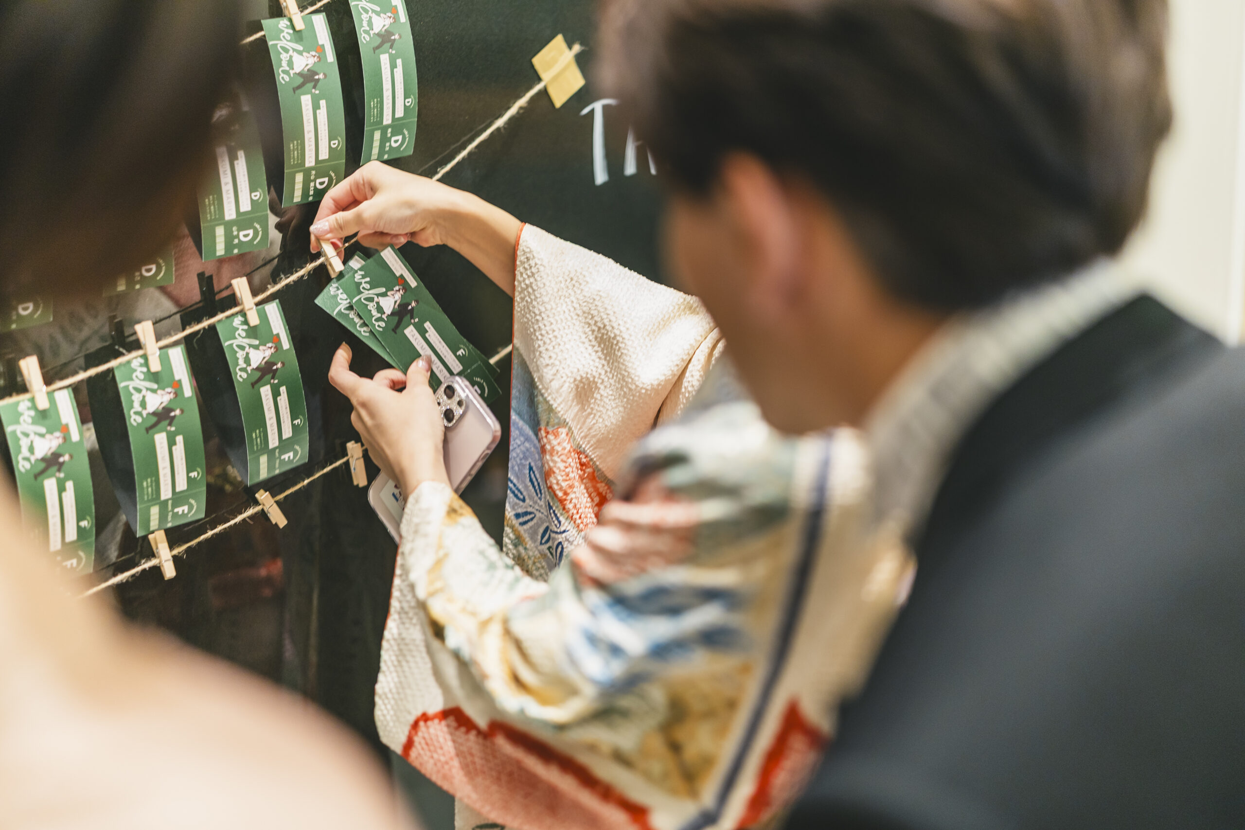 半券タイプになっているエスコートカードを皆様お取りいただき、カラードレスの色あて投票を実施。