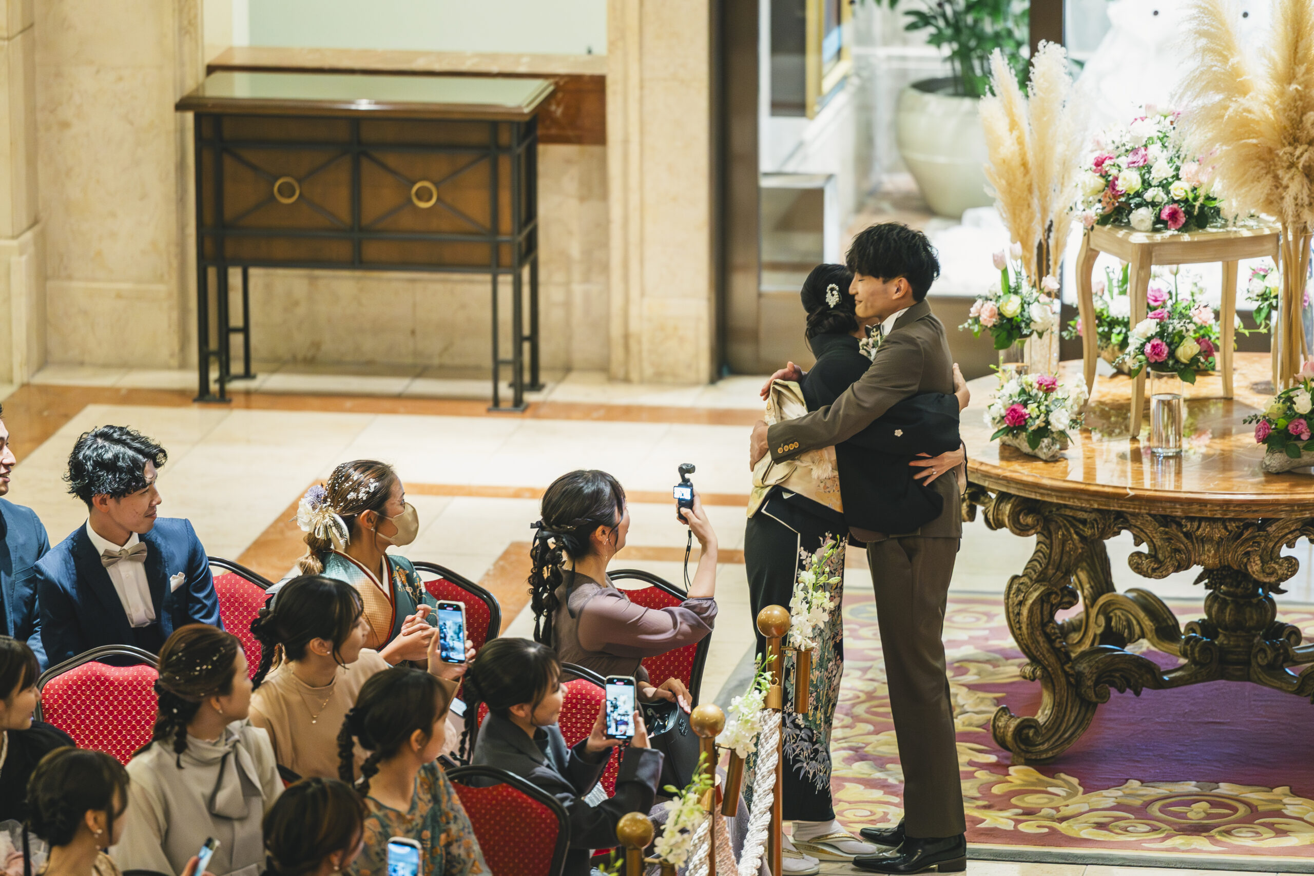 新郎様入場時、ジャケット、グローブセレモニーをご両親様にしていただいた後の、ハグ。