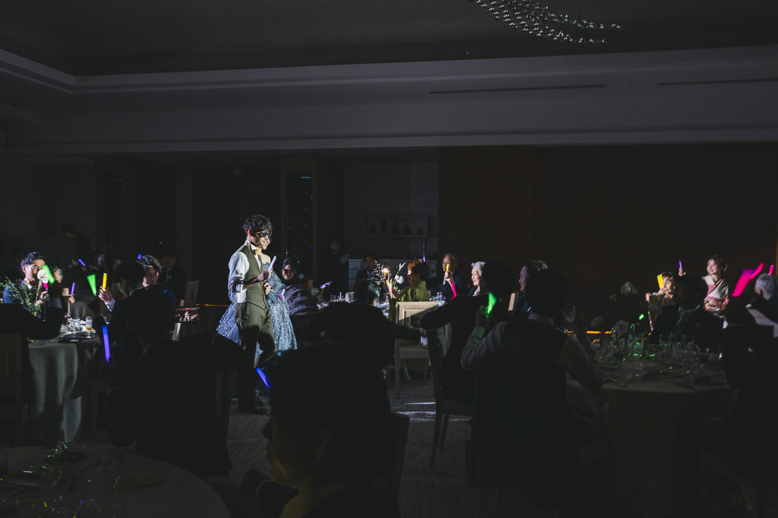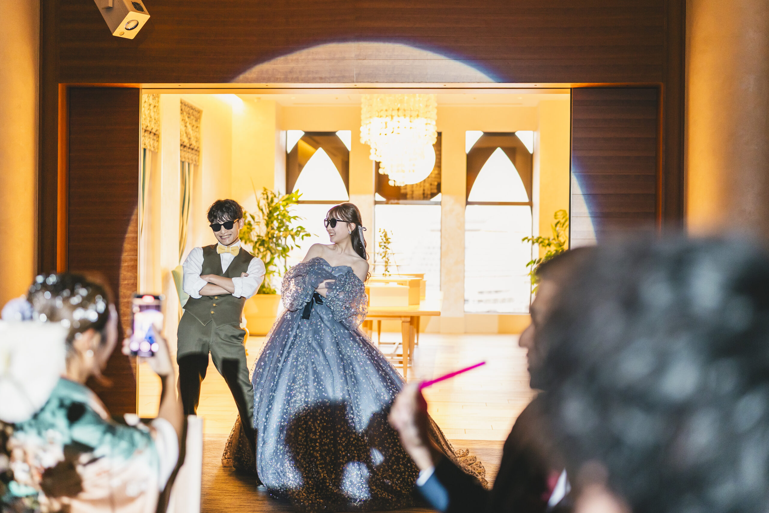 ゲストの皆様も、カラードレスのお色を予想して選ばれたペンライトを曲に合わせて振り、お二人のご入場を盛大に盛り上げて下さいました。