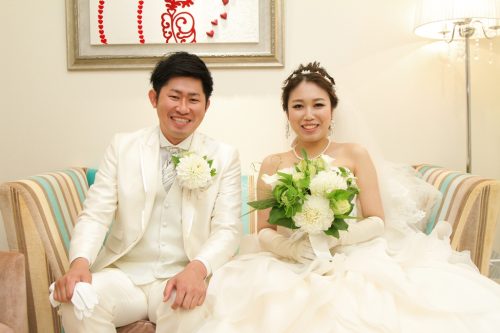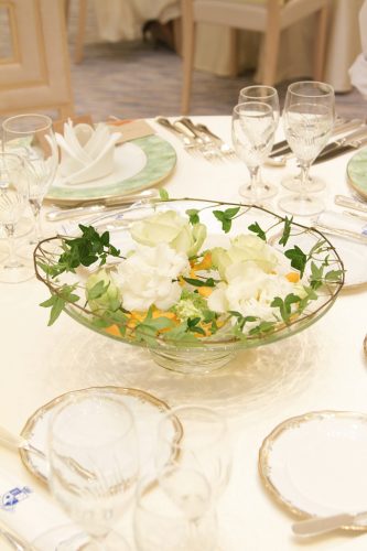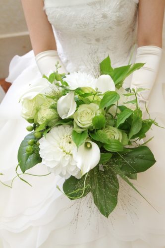 自分自身が花に詳しくないので、イメージを伝えるのに一番苦労しました。色々な写真を見て「あーでもない、こーでもない」と打ち合わせをしながら、無理を言って前々日に高砂のセッティングにも入らせていただきました。ありがとうございます。ブーケも当日までどのような仕上がりになるか楽しみにしていましたが、こちらもイメージ通り仕上げて下さりました。
