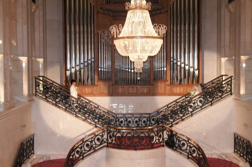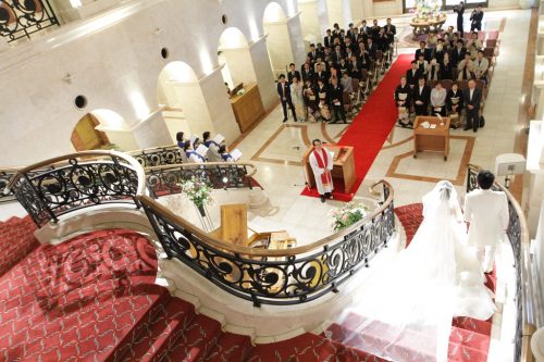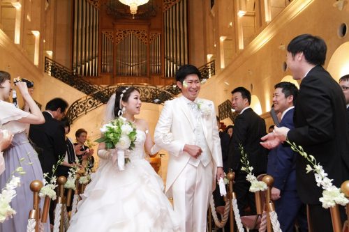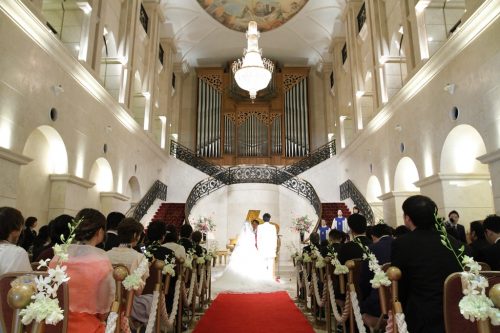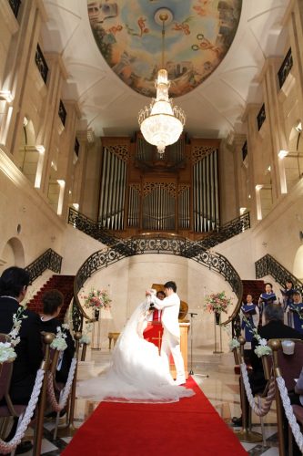 パイプオルガンやレッドカーペットの大階段。一言、、圧倒されました。上記にも書きましたが、幼い頃に見た大階段が忘れられなかったのも理由の一つですが、ゲストの皆様にも印象づけることの出来る挙式会場はここしかないなと思い、エントランスにしました。
