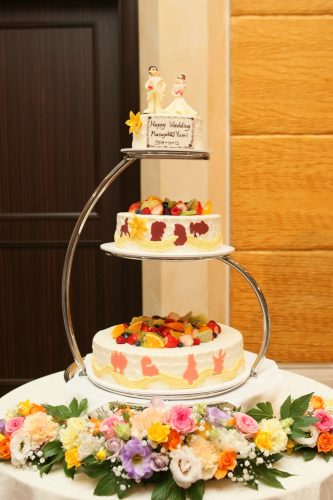 ケーキはオーダーメイドさせていただきました。披露宴のテーマはラプンツェル。それでも不思議の国のアリスも好きだったので両方の絵をチョコレートで作ってもらい、自分たちのリングをイメージしたケーキに使用しました。イラスト通り再現してもらい、大変満足です。