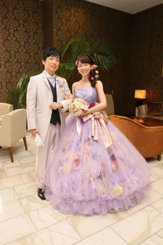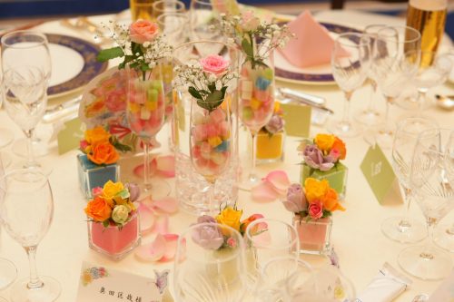 たくさんの色とりどりの花を高砂に、各テーブルもカラフルにしてもらいました。カラードレスのときもラプンツェルをイメージした花飾りを作ってもらい満足です。