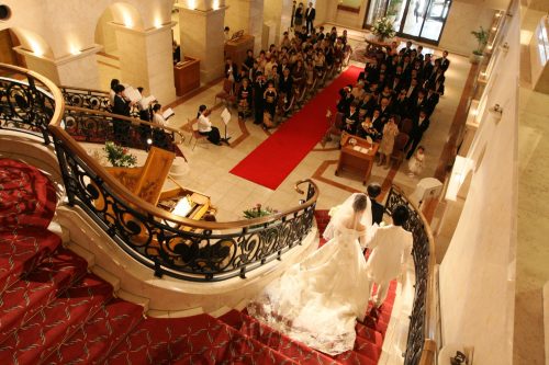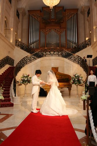 まず、エントランスホールのピアノと大階段に惹かれました、披露宴会場の雰囲気も豪華絢爛。