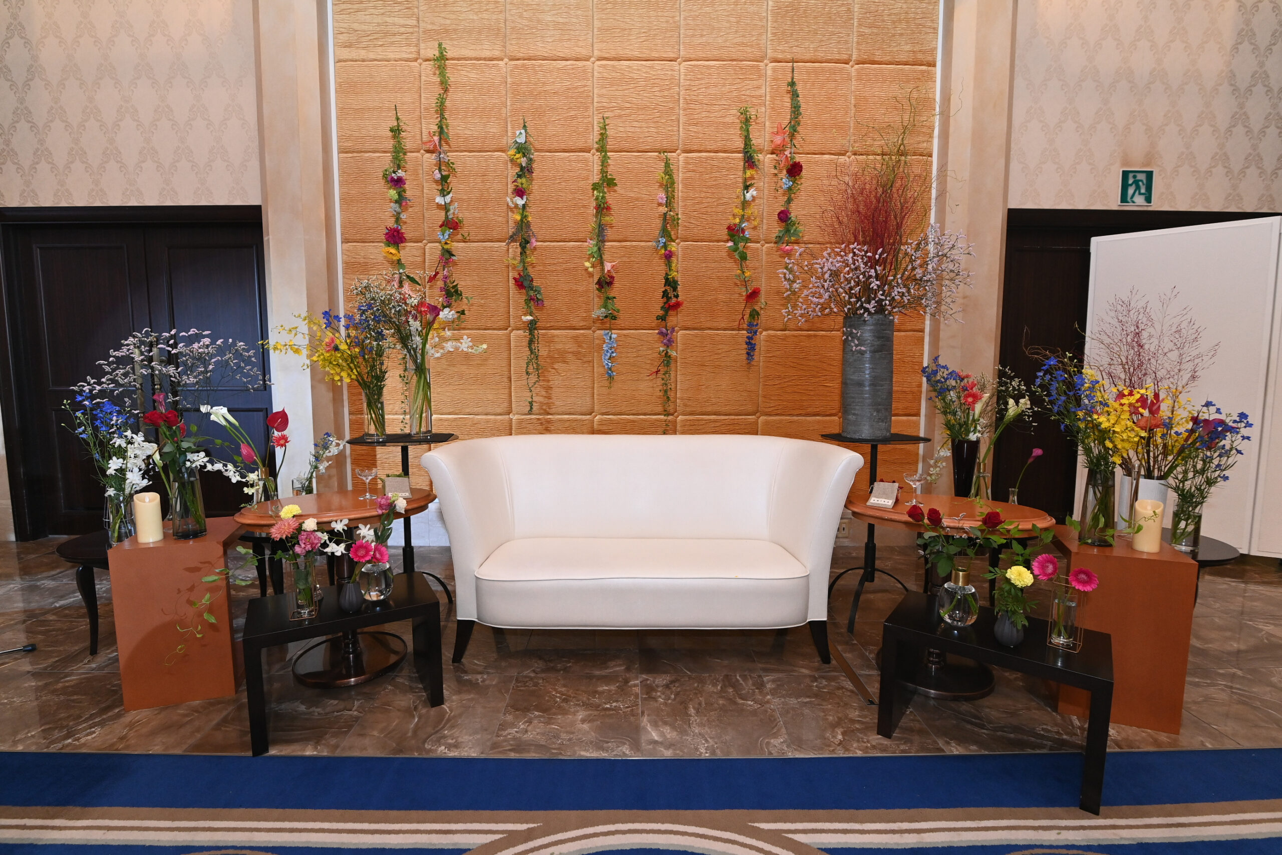 バックは、お花を上から垂らし、どの角度から見ても素敵な可愛らしい華やかな空間に。
