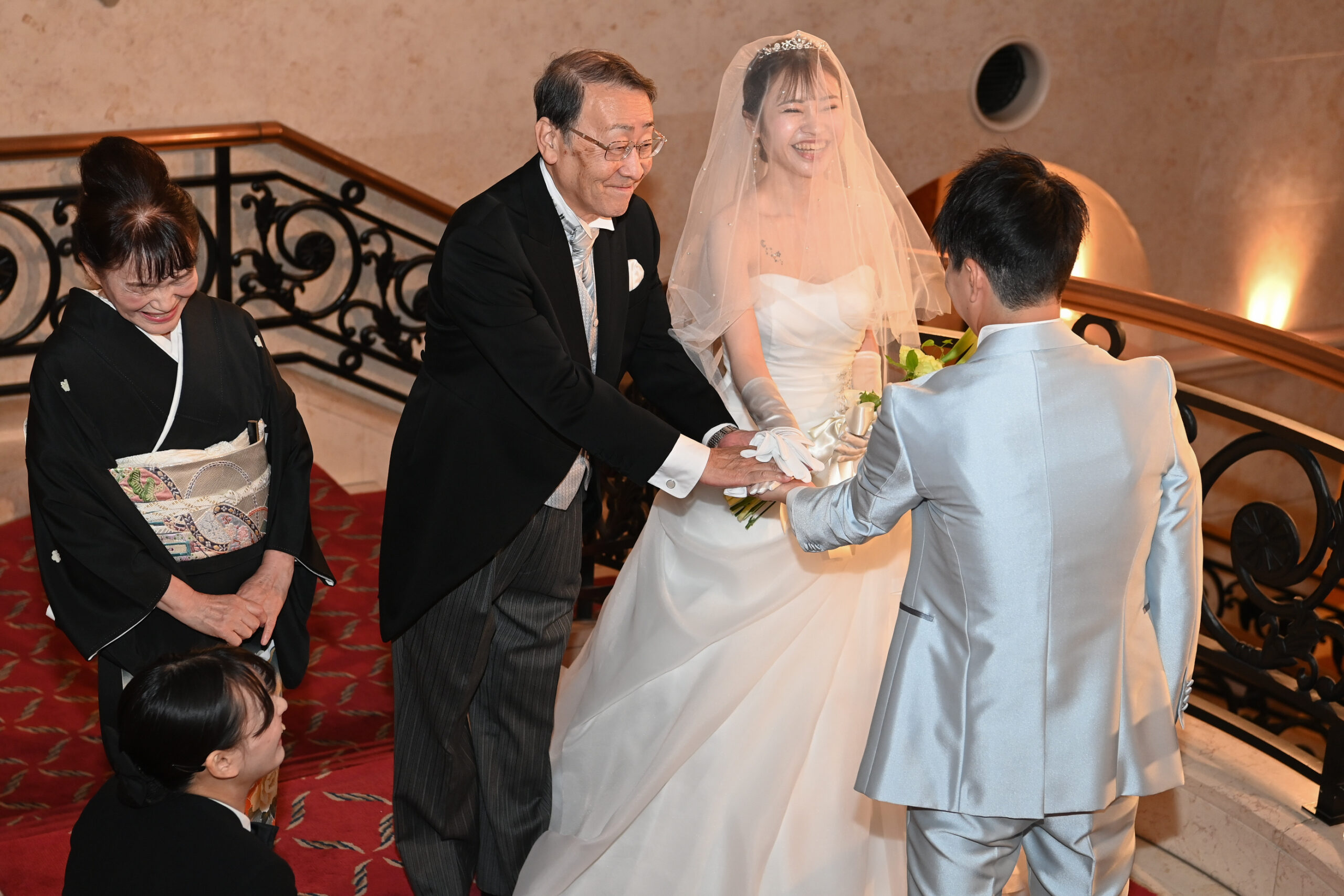 新婦様はお父様とご入場、お母様より最後のお支度としてベールダウンをしていただき、お父様の手で、新郎様へエスコートチェンジ。