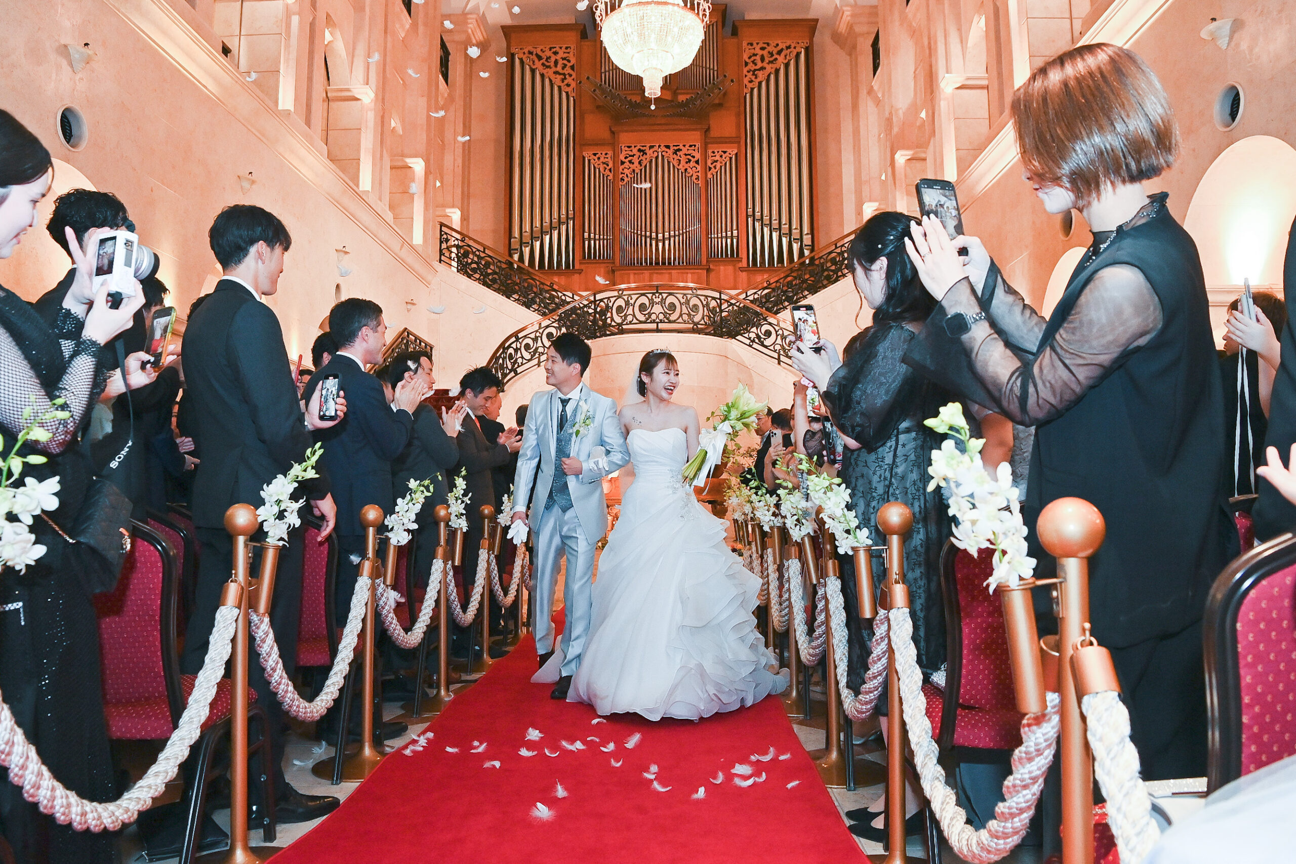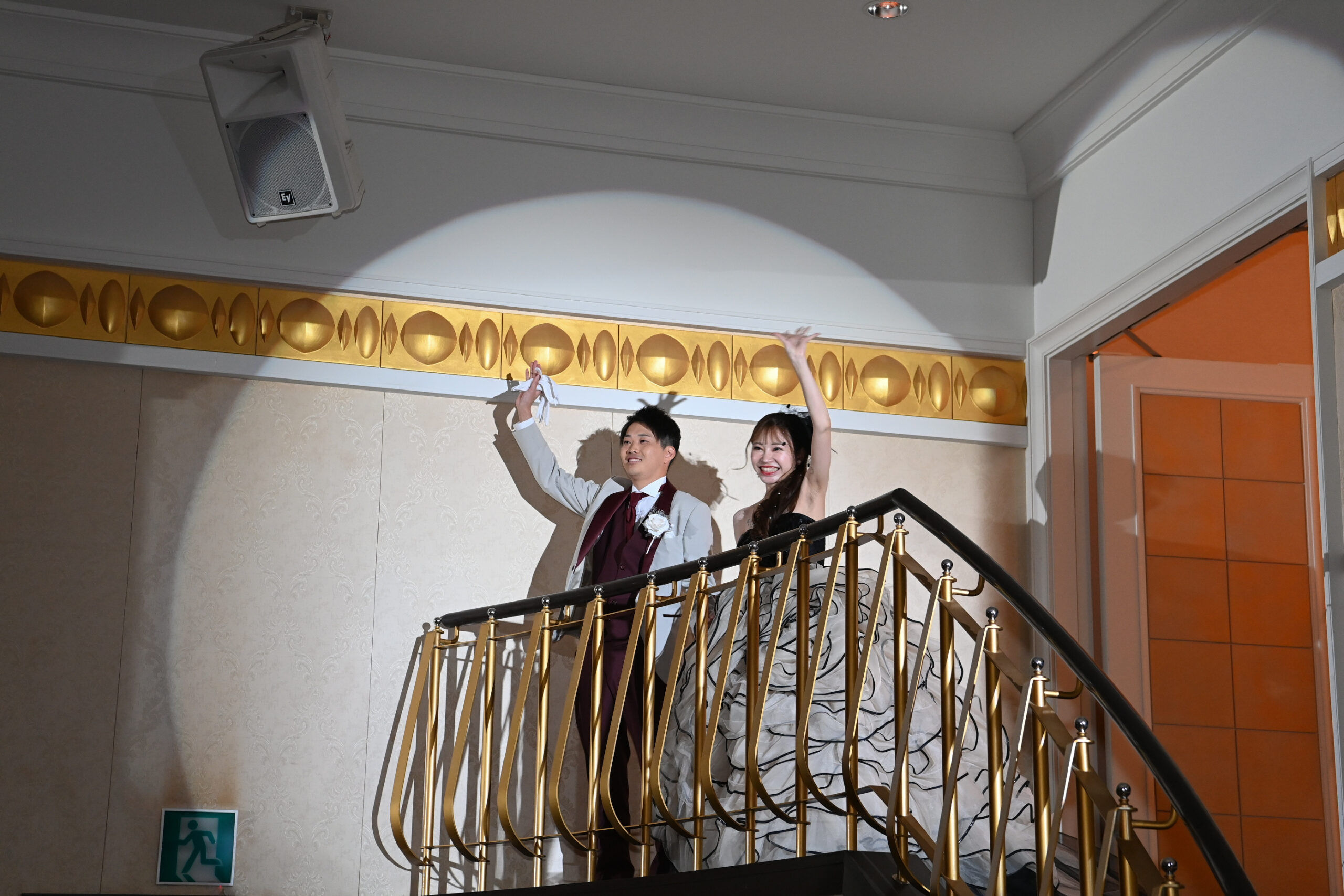 人生の先輩として、先にご両親様階段を進んでいただき、その後にお二人も続き、1階で見守って下さっているご参列の皆さまの元へ。