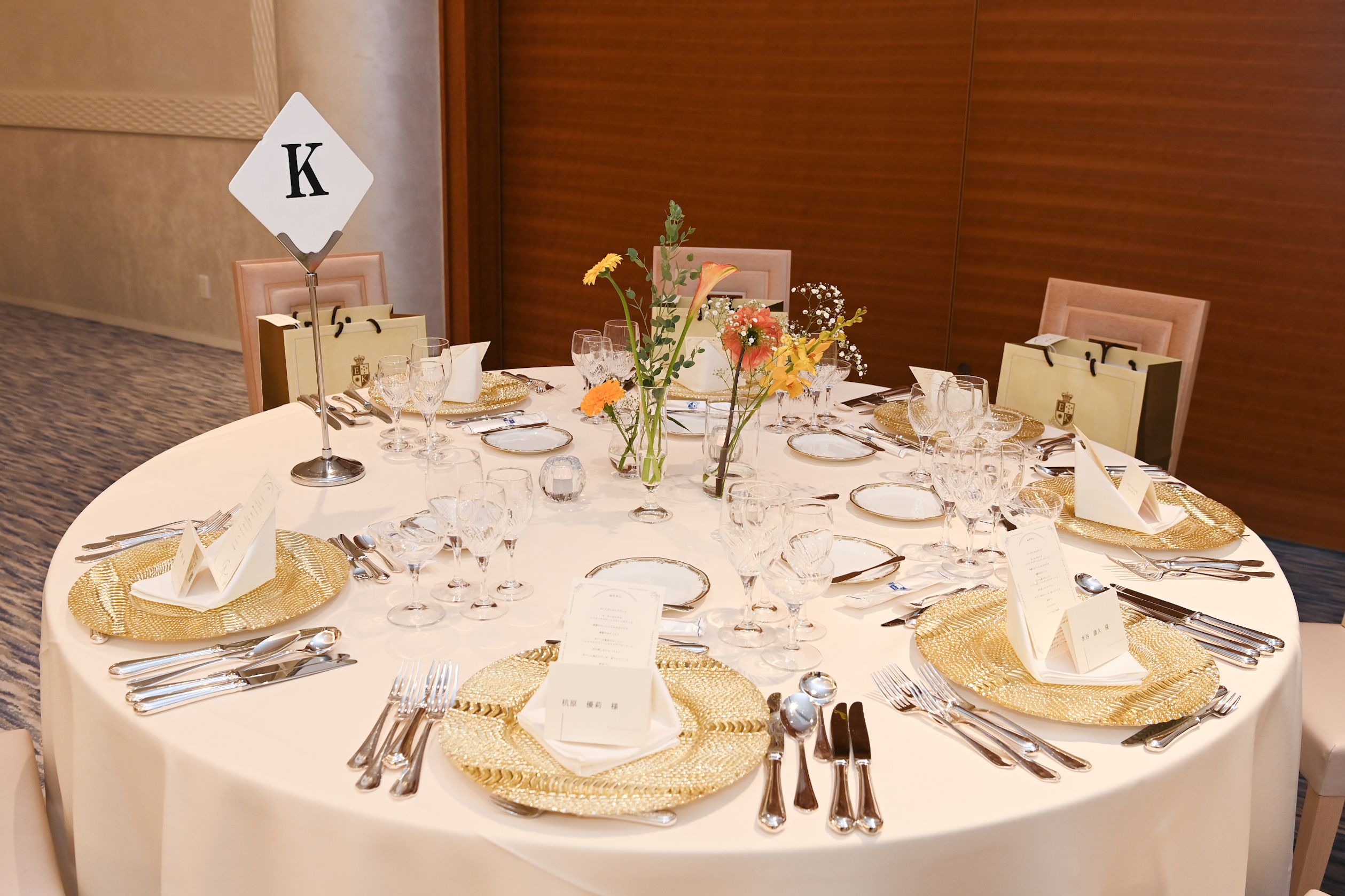 ゲストテーブルは、パールのクロス、スノーホワイトのナプキンに、シャンパンのショープレートでコーディネート。