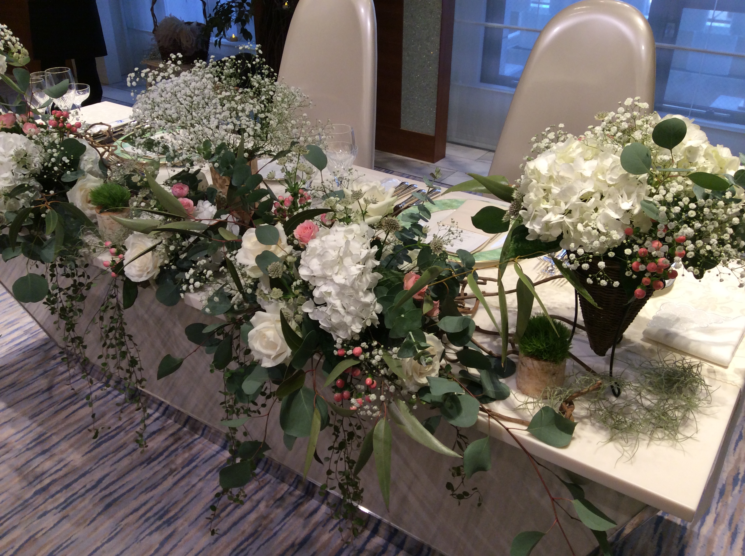 ユーカリをふんだんに使用し、手まり草やスパニッシュモスで動きとインパクトを演出